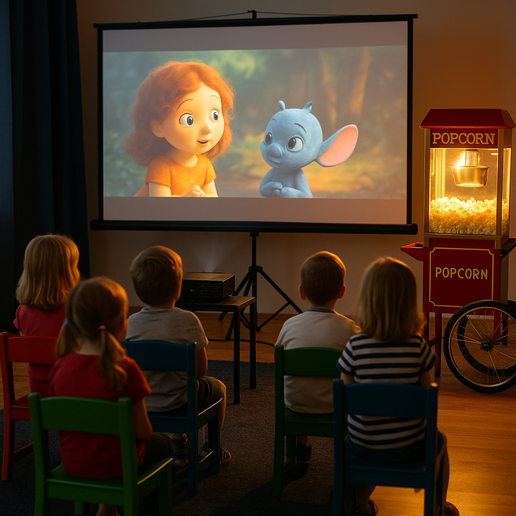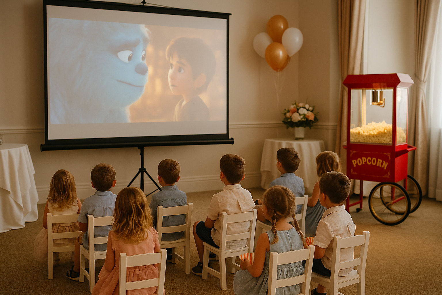 Mit dem Kinderkino der Event Gestaltung Hamburg schenken Sie den kleinen Gästen ein echtes Kinoerlebnis – komplett mit Leinwand, Beamer, gemütlichen Sitzplätzen und auf Wunsch sogar frischem Popcorn.